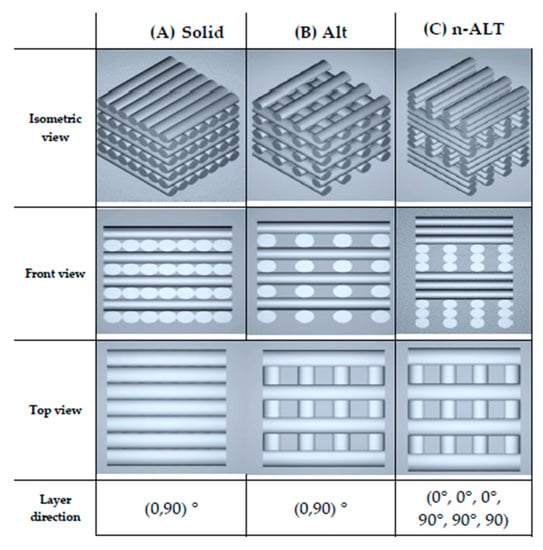 Three different configurations were used for the design of the internal structure of the scaffolds, as shown in Figure 1; they are: a solid one with alternate layers (0°, 90°), a porous one with 30% infill and alternate layers (0°, 90°) (from now on, ALT) and finally another configuration where 3 layers are piled before changing the orientation (0°, 0°, 0°, 90°, 90°, 90°) also with 30% infill (n-ALT). All layer patterns were rectilinear and a layer height of 0.25 mm was used, unless stated otherwise.