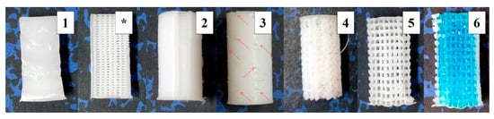 Pictures of the six different specimens: (1) Section of solid (100%) infill; (*) Section of the 30% alternated scaffolds [,]; (2) Aligned seam from fixed starting point at 30% ALT with shell; (3) Random starting point appearance at 30% ALT with shell; nonaligned defects pointed out with arrows; (4) Scaffold resulting from a slow cooling down at 30% n-ALT; (5) Forced cooling down (external fan) of 30% n-ALT; (6) 30% n-ALT filled with the hydrogel and blue colorant for a better contrast (from now 30% n-ALT+hyd).