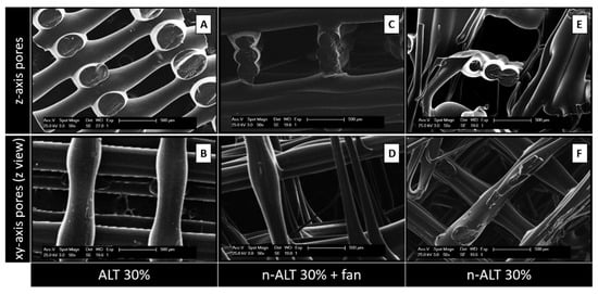 SEM images from the alternated (A,B) and not alternated (C–F) scaffolds, obtained from lateral sections of cut samples (A,C,E) or from the top (B,D,F) can be found in Figure 3. Image A, that represents the most commonly used z-stack, shows a high anisotropic relation between the pore size in the z-axis when compared with the xy-pore (image B). While C shows a regular and ordered structure, due to a faster cooling down, image E reveals a more chaotic pattern, with some closed pores. The same effect can be observed from the top; in F, the polymer flowed a little bit before setting, creating flatter and thinner strands, in contrast with more cylindrical ones observed at D.