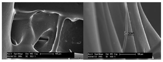 In a more detailed view of the scaffolds with a slow rate of cooling down (30% n-ALT), we can observe the presence of random microfibers and pores with different sizes and morphologies (Figure 4).