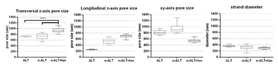 Box and whiskers plot for pore sizes measured with ImageJ at z- axis (transversal = horizontal, longitudinal = vertical) and at xy-axis (in any direction between parallel walls), along with the strand diameter. (n = 3 samples with at least 4 measurements per sample, mean ± SD, **** p < 0.001).