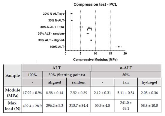 Among the samples with a 30% of infill, scaffolds with alternate strands (ALT) held up higher stresses than those where the direction of the strand was changed after three layers (n-ALT). Among the non-alternate configurations (n-ALT), a higher compressive modulus was found when the cooling down temperature was forced by the use of the external fan (n-ALT +fan). Non-alternate structures (n-ALT) have bigger z-axis pores, as they present more transversal strands. Because of this, the n-ALT configuration leads to an easier layer collapse, weakening the scaffold, as can be shown in the reduction in the compressive modulus.