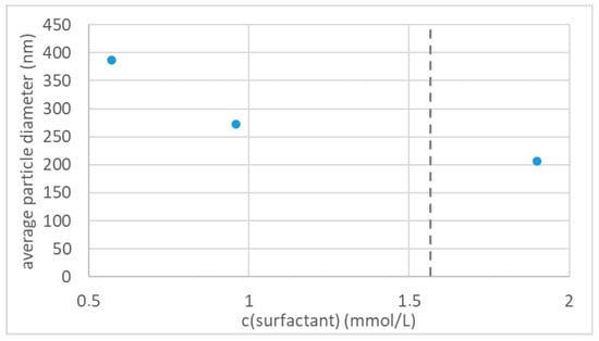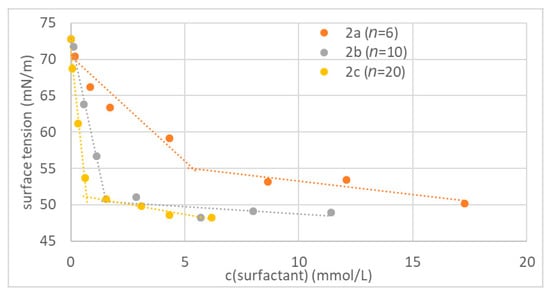 To study the surfactant properties of the three synthesized oligoglycidol surfmers 2a–c with 6, 10 and 20 repeating units, we performed pendant drop measurements on aqueous solutions at various concentrations of each macromolecule. Here it was important to prepare the solutions 2 h before measurement to reach stable surface tension values. For all three surfactants the surface tension decreased rapidly with increasing concentration before it reached values between 50 and 55 mN·m−1 at the CMC (Figure 2), where further increase in surfactant concentration only led to a small decrease in surface tension. With increasing oligoglycidol chain length the CMC was reached at a lower concentration. Therefore, the surfactant properties of oligoglycidol surfmer increased with increasing chain length. For the macromolecules 2a–c with 6, 10 and 20 repeating units CMCs of 5.38, 1.55 and 0.69 mmol·L−1, respectively, were determined. The results obtained via surface tension measurements suggest that an increase in oligoglycidol chain length leads to an increase in hydrophobicity of the macromolecule, since according to Traube’s rule an increase in hydrophobicity of the surfactant will lead to an increase in surface activity []. An increase in oligoglycidol chain length increased both the number of polar OH groups and the number of apolar CH2 moieties in the surfmer. The results obtained via surface tension measurements suggest that the influence of the apolar moieties dominates, and therefore the overall hydrophobicity of the surfactant increased with increasing oligoglycidol chain length. The surfactant 2a with the CMC at the highest concentration was used to study the influence of oligoglycidol surfmer concentration on the particle size below the CMC.