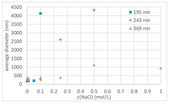After synthesizing polystyrene nanoparticles of various sizes and stabilized with different oligoglycidol surfmers, we analysed the colloidal stability of the nanoparticle dispersions in aqueous NaCl solutions. Therefore, we used nanoparticle dispersions at a distinct solid content and added those to NaCl solutions of several concentrations. Afterwards we immediately conducted DLS measurements to analyse the average particle size, which was recorded 3 min after sample preparation. Firstly, we analysed the colloidal stability as a function of the particle size. For this, we used three particle dispersions functionalised with 2a and an average particle size between 195 and 369 nm (3e–g, respectively). We analysed the colloidal stability of each of these particle dispersions at NaCl concentrations between 0.01 and 5 mol·L−1. The particles with the smallest particle size of 195 nm were stable up to a NaCl concentration of 0.05 mol·L−1 (Figure 6, blue squares). Upon a further increase in NaCl concentration the particles immediately started to form large agglomerates. Larger particles, which are prepared with less surfmer, displayed an improved colloidal stability (Figure 6, orange diamonds and grey triangles). The polystyrene particles with an average size of 243 nm (Figure 6, orange diamonds) were still stable at an NaCl concentration of 0.1 mol·L−1 and first started to form medium sized agglomerates at an NaCl concentration of 0.25 mol·L−1 before large agglomerates were formed at 0.5 mol·L−1. This trend continued further for increasing particle size. The nanoparticles with an average diameter of 369 nm (Figure 6, grey triangles) were still stable at 0.25 mol·L−1 NaCl, only started to form clusters of 2–3 particles at a concentration of 0.5 mol·L−1 and further increase of NaCl concentration did not impact the colloidal stability further. Up to a NaCl concentration of 5 mol·L−1 only clustering of 2–3 particles occurred without formation of large agglomerates.