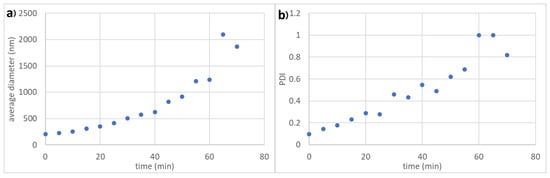(a) Average particle size and (b) PDI over time of nanoparticles with 195 nm average diameter and oligoglycidol6 surface functionality at 0.05 mol·L−1 NaCl.