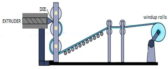 In general, the production of flexible packaging is based on the preparation of plastic films using different converting processes, such as cast extrusion (Figure 3) and blown film (Figure 4). Flat die extrusion (Figure 3) allows the production of polymeric sheets and films (with a thickness ranging between 50 μm and 1 mm) and consists of the extrusion of the molten polymer through a linear die of rectangular geometry [1].