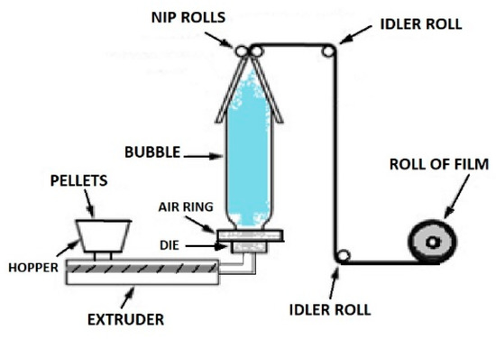Blown film extrusion is used to produce pouches, industrial bags, or packaging films for shrink-wrapping because the produced film is tubular. The equipment consists of an extruder equipped with an annular die (Figure 4) [1].