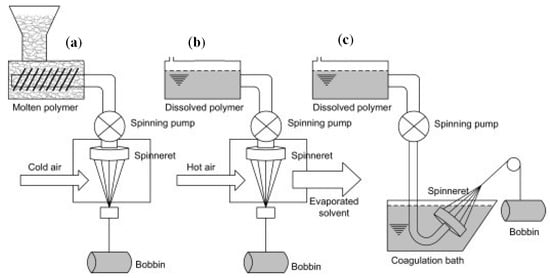 For textile applications, high crystallinity is needed to prepare fiber structures [32]. Fibers composed of PLA show the most potential to be used as the raw material for textiles due to their similarity to other thermoplastics [62]. For example, the mechanical properties of polyethylene terephthalate (PET) fibers are like fibers composed of PLA. PLA fibers have yarns with low moisture absorption and fast drying properties [63].