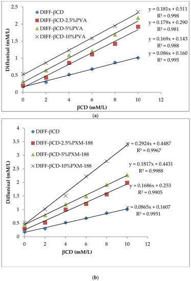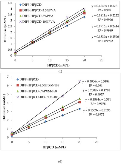 The addition of hydrophilic polymers was found to improve the solubilization and complexation efficiency of cyclodextrins [28]. In view of the favorable effect as a result of incorporation of hydrophilic polymers, PVA, CMC-Na, and PXM-188, were used for diflunisal in the present study. These hydrophilic polymers could ameliorate the solubilizing and complexation efficiency of cyclodextrins and their derivatives [29,30,31].