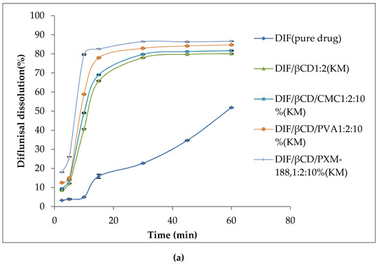 Figure 2a,b showed the dissolution of DIF, binary and ternary complexes with different contents of PVA, CMC-Na or PXM-188. DIF manifested the least dissolution, with approximately 50% of drug released after one hour. It could be observed that the percentage of drug release of both βCD and HPβCD binary systems was comparatively higher than that of DIF. The addition of hydrophilic polymers further increased the drug release rate. The ternary system of DIF/HPβCD/PXM-188 yielded the highest dissolution. The ternary system with CMC-Na and PVA also showed improved dissolution than their corresponding binary systems, but less than PXM-188. The reason behind this is their viscosity, which hinders the diffusion of dissolution medium to the powdered product. Capello et al. (2001) reported that interaction of either the CD molecule or drug–CD complex with the hydrophilic polymers could lead to formation of aggregated hydrates in the solution, increasing the thickness of the diffusion layer and ultimately, slowing the drug release. The dissolution efficiency (DE) and time taken for 50% drug release (T50%) results are presented in Table 3. The DE and T50% values were statistically analyzed using ANOVA (post hoc Tukey HSD test). The rate of in vitro dissolution for DE and T50% values was statistically significant different when DIF and its inclusion complexes were analyzed. A statistically significant difference (p < 0.05) was observed when compared to the DE values of the binary kneaded mixture with pure DIF, whereas ternary complexes produced significant differences (p < 0.05) and improved DE as compared to the binary kneaded mixture. The longest T50% was observed for DIF as compared to its binary and ternary systems. The improved dissolution could be possibly described by the decrease in drug crystallinity of binary and ternary systems.