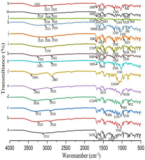 FTIR spectra of (a) DIF; (b) βCD; (c) HPβCD; (d) PVA; (e) CMC-Na; (f) PXM-188; (g) DIF/βCD (1:2); (h) DIF/HPβCD (1:2); (i) DIF/βCD (1:2) PVA 10%; (j) DIF/βCD (1:2) CMC-Na 10%; (k) DIF/βCD (1:2) PXM-188 10%; (l) DIF/HPβCD (1:2) PVA 10%; (m) DIF/HPβCD (1:2) CMC-Na 10%; (n) DIF/HPβCD (1:2) PXM-188 10%.