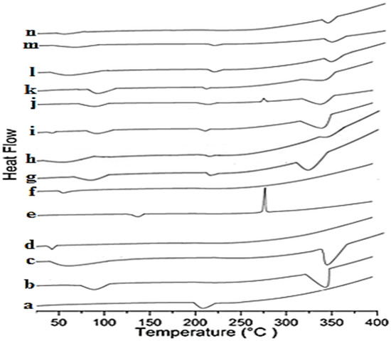 DSC thermograms of (a) DIF; (b) βCD; (c) HPβCD; (d) PVA; (e) CMC-Na; (f) PXM-188; (g) DIF/βCD (1:2); (h) DIF/HPβCD (1:2); (i) DIF/βCD (1:2) PVA 10%; (j) DIF/βCD (1:2) CMC-Na 10%; (k) DIF/βCD (1:2) PXM-188 10%; (l) DIF/HPβCD (1:2) PVA 10%; (m) DIF/HPβCD (1:2) CMC-Na 10%; (n) DIF/HPβCD (1:2) PXM-188 10%.