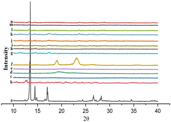 XRD diffractograms of (a) DIF; (b) βCD; (c) HPβCD; (d) PVA; (e) CMC-Na; (f) PXM-188; (g) DIF/βCD (1:2); (h) DIF/HPβCD (1:2); (i) DIF/βCD (1:2) PVA 10%; (j) DIF/βCD (1:2) CMC-Na 10%; (k) DIF/βCD (1:2) PXM-188 10%; (l) DIF/HPβCD (1:2) PVA 10%; (m) DIF/HPβCD (1:2) CMC-Na 10%; (n) DIF/HPβCD (1:2) PXM-188 10%.