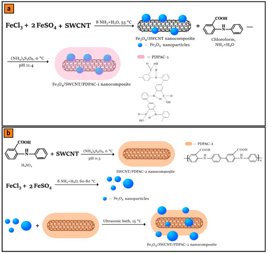 Synthesis sequence of Fe3O4/SWCNT/PDPAC in alkaline (a) and acidic media (b).