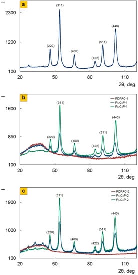 X-ray diffractograms of Fe3O4/SWCNT (a), PDPAC, and Fe3O4/SWCNT/PDPAC, prepared in alkaline (b) and acidic media (c).