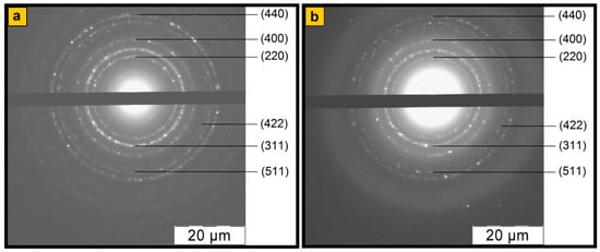 The data presented in Figure 2 allow us to conclude that the phase composition of the nanocomposites does not depend on the synthesis reaction medium pH. According to the XRD data, irrespective of the synthesis method, diffractograms of Fe3O4/SWCNT/PDPAC identify reflection peaks of Fe3O4 in the range of scattering angles 2θ = 46.1°, 54.3°, 66.8°, 84.8°, 91.2°, and 102.2° (CrKα radiation) [43]. These diffraction peaks correlate to Miller indices (220), (311), (400), (422), (511), and (440), respectively, and refer to the cubic structure of Fe3O4 (JCPDS 19-0629) [50]. As can be seen in Figure 3, electron diffraction confirms the crystalline nature and phase composition of Fe3O4 nanoparticles. The diffraction rings correspond to Fe3O4 crystals. Since the single plane of SWCNT does not give a diffraction pattern, there is no carbon phase reflection peak at 2θ = 39.8°. An amorphous halo in the range of scattering angles 2θ = 20°–43° in the diffraction patterns of nanocomposites characterizes the polymer component (Figure 2b). The small wide diffraction peaks in the range of 2θ = 20°–43° characterize the crystalline DPAC oligomers contained in the polymer fraction of nanomaterials obtained in the acidic medium (Figure 2c), which is also confirmed by the DSC data. Removal of the crystalline low molecular weight fraction by washing nanocomposites with acetone can lead to a dedoping of the polymer component.