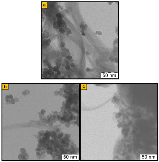 There are two most common approaches to the preparation of polymer–metal–carbon nanocomposites. The first way is the in situ oxidative polymerization of aromatic amines in the presence of magnetic nanoparticles immobilized on the surface of carbon nanomaterials [19,20,23,29,39,40]. The second approach provides the in situ oxidative polymerization of aromatic amines in the presence of carbon nanomaterials followed by the deposition of magnetic nanoparticles on the polymer surface [21,22,25,38]. Depending on the synthesis way, prefabricated magnetite nanoparticles uniform in size and shape were used to synthesize the Fe3O4/MWCNT and Fe3O4/RGO nanocomposites [19,20,23]. Graphene oxide was reduced with hydrazine [20,22,25]. Multi-walled carbon nanotubes (MWCNT) were pretreated with concentrated acids to functionalize their surface [21,23]. Modified Fe3O4 nanoparticles were added to the reaction solution containing MWCNT/PANI [21].