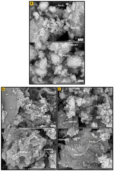 SEM images of Fe3O4/SWCNT (a) and Fe3O4/SWCNT/PDPAC, prepared in alkaline (b) and acidic media (c).