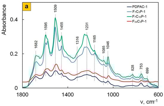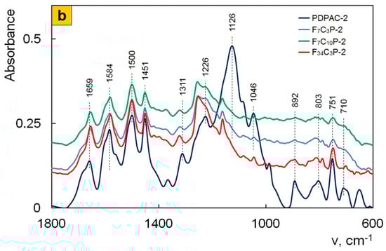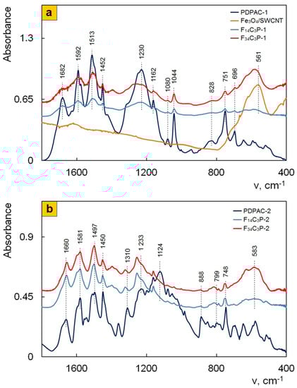 As the content of carbon nanotubes increases, ATR FTIR spectra of Fe3O4/SWCNT/PDPAC-1 nanocomposites (Figure 7a) demonstrate a bathochromic shift in the PDPAC-1 skeletal vibration frequencies at 10–16 cm−1, which indicates the π–π* interaction of aromatic units of the polymer with the Fe3O4/SWCNT surface in an alkaline medium (stacking effect). The polymer formation on the Fe3O4/CNT surface provides the charge transfer, which is manifested in the shift of skeletal oscillation frequencies of the polymer [53,54,55].