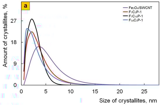 Fe3O4 crystallites size distribution in Fe3O4/SWCNT and Fe3O4/SWCNT/PDPAC, prepared in alkaline (a) and acidic media (b).