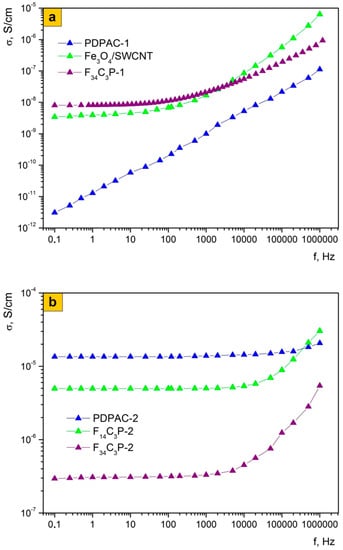 At low frequencies, the Fe3O4/SWCNT/PDPAC-1 nanocomposites as well as Fe3O4/SWCNT are characterized by weak frequency dependence on electrical conductivity. At the same time, the electrical conductivity of nanocomposites is several orders of magnitude higher than that of PDPAC-1 (3.1 × 10−12 S/cm) and amounts to 3.5 × 10−9 S/cm (F34C3) and 8.1 × 10−9 S/cm (F34C3P-1) at 0.1 Hz (Figure 9a). Apparently, the conductivity of Fe3O4/SWCNT/PDPAC-1 is contributed significantly by the metal–carbon Fe3O4/SWCNT nanocomposite, i.e., the increase in electrical conductivity of nanomaterials is due to the presence both of SWCNT and magnetite nanoparticles. As frequency grows, the electrical conductivity of F34C3P-1 increases gradually by two orders of magnitude to 8.7 × 10−7 S/cm.