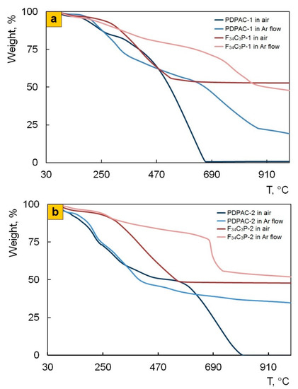Thermogravimetric analysis (TGA) was performed on a Mettler Toledo TGA/DSC1 (Giessen, Germany) in the dynamic mode in the range of 30–1000 °C in air and in the argon flow. The weight of the samples was 100 mg, the heating rate was 10 °C/min, and the argon flow velocity was 10 mL/min. Calcined aluminum oxide was used as a reference. The samples were analyzed in an Al2O3 crucible.