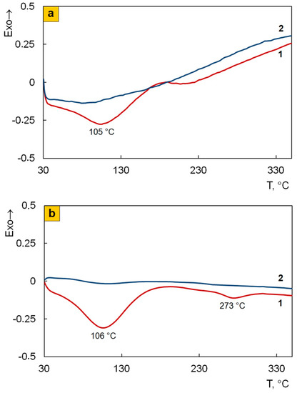 DSC thermograms of Fe3O4/SWCNT/PDPAC, prepared in alkaline (a) and acidic media (b), at heating in the nitrogen flow to 350°C (1—first heating, 2—second heating).