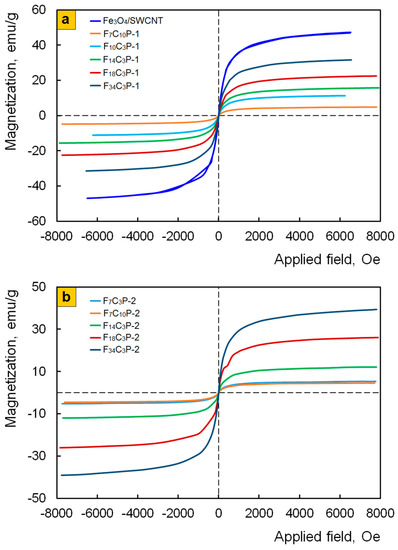 It can be seen that, regardless of the preparation method, the Fe3O4/SWCNT/PDPAC nanocomposites are superparamagnetic; this is due to the small size and high dispersion of magnetic nanoparticles [49,61]. The squareness ratio of the hysteresis loop is кS = MR/MS = 0. The saturation magnetization MS depends on the content of magnetite nanoparticles and reaches 31.6–39.4 emu/g depending on the synthesis method of nanocomposites. An increase in the concentration of SWCNT to 10 wt. % has little effect on the main magnetic parameters of the nanomaterials (Figure 12b).