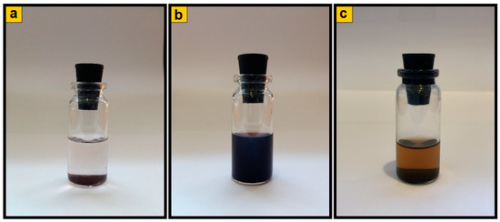 Suspensions of Fe3O4/SWCNT (a) and Fe3O4/SWCNT/PDPAC, prepared in alkaline (b) and acidic media (c) in ethanol. (a,c)—in 5 min, (b)—in 8 months.
