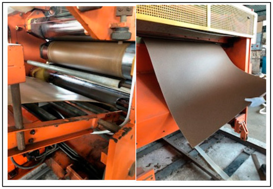 The PBS pallets and EFB fiber was first dried in an oven at 80 °C to prevent excessive hydrolysis which can compromise physical properties of the polymer. Starch, glycerol and EFB were dry mixed in an industrial mixer machine and sieved to remove excessive lumps during the mixing process. Then, PBS and the mixed compound of starch/EFB/glycerol were added into an industrial counter rotating extruder feeder for a total of 300 kg per processing. After that, the compound was melted in an industrial extruder machine comprising 10 heat zones, which were set temperatures in between 115–145 °C with rotation speed of 80 RPM. As a result of the shear stress imposed on fibers during compounding, homogenization of PBS/starch/fiber/glycerol was carried out by cycling the mixture in the extruder for 15 min and then extruded through a 2 mm gauge strand die at a rate of 10 mm/s. The melted compound was then passed through a calendaring machine before producing a sheet. Then, the sheets were cut into shapes according to specific characterization testing. The image of the extruded compound is shown in Figure 1.