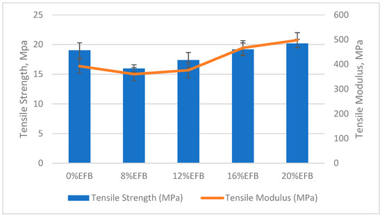 On the other hand, it was found that there was poor interfacial adhesion between the EFB and PBS matrix, leading to lower mechanical properties. Fortunately, this was overcome and improved by higher fiber reinforcement, that regulated a better load transfer mechanism. Higher fiber loadings have improved the flexural strength due to mechanical interlocks found between the fiber and matrix. As a result, the tensile and flexural strength had increases of 6.0% and 12.2%, respectively, for 20 wt% EFB reinforcements.