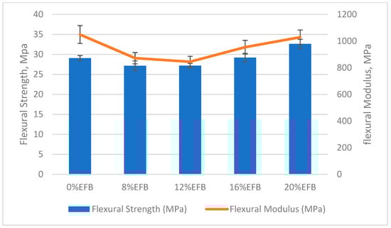 On the contrary, there were relatively higher mechanical properties for a 0% EFB specimen (which contained 30 wt% of starch/glycerol with a 2:1 ratio) in a current study, when compared to a previous study, which only gave 16.12 and 21.78 MPa for tensile and flexural strength, respectively, for pure PBS polymer [34]. The insertion of starch supposedly reduces the composite’s strength performance due to low compatibility [6]. However, the addition of glycerol has the adverse effect of strength deterioration by localization of a compatibilizer at the interface for a stable morphology from a SEM micrographic [42].