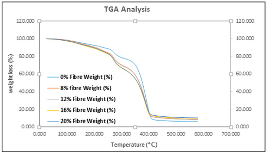 Thermogravimetric analysis (TGA) is a useful method for quantitative determination of the degradation behavior, thermal stability and mass change in a composite. The appearance of starch and glycerol in the PBS polymer composite has reduced the thermal stability of the specimen in generally. Excess amounts of glycerol have taken part in the reaction with hydroxyl groups of the PBS polymer, which promoted a lower thermal stability [43]. However, with more starch/glycerol contents replaced by EFB fibers, the effects of glycerol are lesser and gradually dominated by EFB fibers.