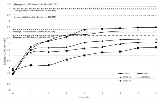 Moisture uptake analysis and average loss of moisture contents for EFB composites.