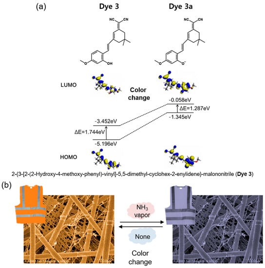 (a) Electron distribution of the HOMO and LUMO energy levels of dye 3 and dye 3a [] and (b) a scheme depicting the color change of the colorimetric nanofiber sensor when exposed to NH3 gas.
