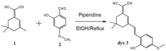 The D-π-A dye (2-{3-[2-(2-hydroxy-4-methoxy-phenyl)-vinyl]-5,5-dimethyl-cyclohex-2-enylidene}-malononitrile, dye 3) for ammonia gas detection was also synthesized as described in our previous study []. An equal molar ratio of 2-(3,5,5-trimethylcyclohex-2-enylidene)malononitrile and 2-hydroxy-4-methoxybenzaldehyde was dissolved in ethanol. Piperidine was titrated to this solution and it refluxed for 7 h. Next, it was filtered and purified (yield = 60%). The synthetic route of dye 3 is shown in Figure 2.
