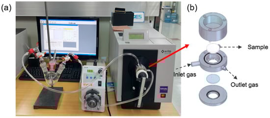 Color measurement system connected with a gas flow device []: (a) picture of our entire system and (b) schematic diagram of the chamber with a loaded sample.