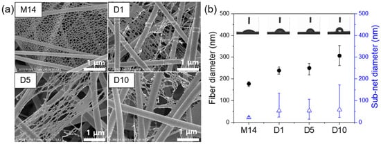(a) FE-SEM images of the electrospun meta-aramid mats with various dye 3 concentrations and (b) fiber and sub-net size distribution of as-prepared nanofiber mats.