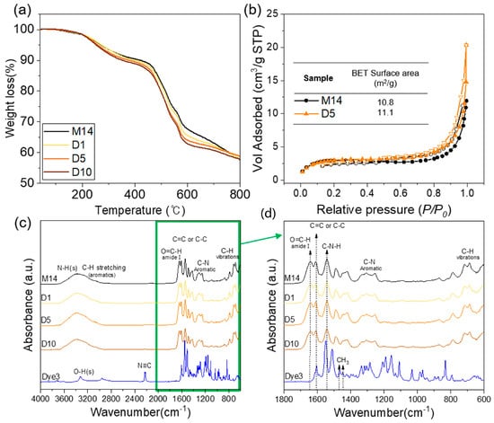 (a) TGA, (b) Brunauer–Emmett–Teller (BET) analysis of electrospun meta-aramid mats with and without dye 3, (c) FT-IR spectroscopy of meta-aramid nanofiber with and without dye 3 indicator, and (d) FT-IR spectra in the range of 1800–600 cm−1.