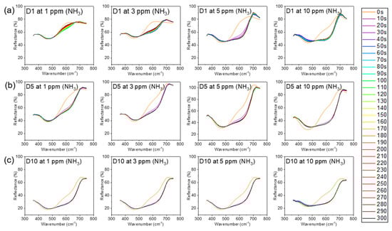 where L* is lightness, a* represents red/green component, and b* represents yellow/blue component. NH3 gas was used at a concentration of 1–10 ppm, and the color change was measured every 10 s for 5 min.