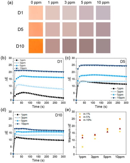(a) Color changes of each nanofiber sensor after exposure to various NH3 concentrations (1, 3, 5, and 10 ppm); (b–d) the time-dependent ΔE values of the meta-aramid/dye 3 nanofiber sensor specimens after exposure to various NH3 concentrations (1, 3, 5, and 10 ppm); and (e) the maximum ΔE values of the meta-aramid/dye 3 nanofiber specimens containing various amounts of dye 3.