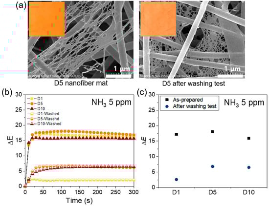 To investigate the washability and durability of the nanofiber colorimetric sensor, the washing test was performed according to method A of standard ISO 105C10. FE-SEM images and optical photographs of a nanofiber sensor specimen before and after washing are shown in Figure 8a. There was no significant difference in the diameter of the fibers after washing; however, the net structure of the fibers appeared to merge slightly. Furthermore, it was visually confirmed that the dye 3 drained slightly from the specimen after washing. The washed nanofiber sensor specimens with various dye contents were tested with 5 ppm of NH3 gas and the results are shown in Figure 8b–c. After the washing test, the ΔE values of washed nanofiber sensor specimens decreased in comparison to those of as-prepared specimens. The reaction was slightly slower as well. After washing, the maximum ΔE value of D1 nanofiber sensor specimen was 2.6, which marked a decrease of approximately 84% compared to that of the as-prepared specimen. In D5 and D10 nanofiber sensor specimens, the maximum ΔE value also reduced by approximately 62% and 59%, respectively; however, these values (6.8 and 6.5, respectively) were still larger than 5, which is the detection limit of color change. These results showed that this textile-based colorimetric sensor was reusable and washable. Table 2 presents a comparison of the proposed study and the recent colorimetric nanofiber-based studies for ammonia gas detection. Table 2 confirms that the sensing abilities, such as detection limit and response time, obtained in the proposed study are comparable to those obtained in the previously reported studies. However, it is noteworthy to show that it maintained performance after standard washing.