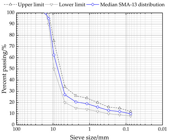 Stone mastic asphalt (SMA) is a widely used asphalt mixture type composed of high-content coarse aggregate, mineral powder and asphalt, as well as low-content fine aggregate, which was initially formed in Germany in the 1960s and first applied in China in 1992 [8] Due to its better resistance to deformation and durability, SMA has been extensively applied for most pavement surfaces of highways in China. In this paper, the median gradation SMA-13 distribution illustrated in Figure 2 was chosen for manufacturing samples.