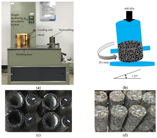 The sample preparation procedure followed the Chinese standard JTG E20-2011 [42]. There are several commonly used molding methods, including Marshall Compaction, Superpave gyratory compaction (SGC), roller compaction, static pressure molding and so on. As one of the important technical achievements of strategic highway research program (SHRP), SGC is a novel Superpave mixture design and molding method. Furthermore, it has been proved that the internal structures of SGC asphalt mixture specimens are consistent with core specimens from an actual road with a good correlation, which have less porosity variability. To better simulate the actual pavement construction, the SGC method (shown in Figure 3a) was selected to prepare asphalt mixtures with basalt fiber in this study. The detailed procedure of specimen preparation has been described in the previous studies [7,8]. The set SGC parameters are also illustrated in Figure 3b. Then, asphalt mixture specimens were first manufactured following the SGC method. After de-molding and cooling, asphalt mixture samples (diameter: 100 mm, height: 150 mm) could be prepared through using a core drilling machine and a cutting machine, as shown in Figure 3c,d.