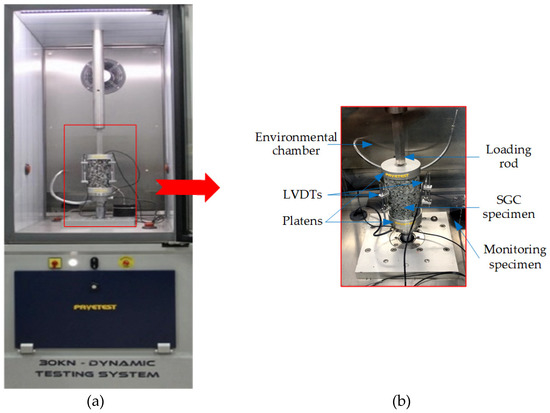 The complex modulus test is a common dynamic experimental method commonly used in asphalt mixture testing. In this paper, a dynamic testing system (DTS) with 30 kN servo-hydraulic and 100 mm range was employed to perform complex modulus tests according to the specification of AASHTO TP 79 [43]. The DTS with an environmental chamber has a loading range of ±16 kN, a frequency of up to 70 Hz, and controlled within −20 °C to 80 °C. Before the complex modulus test, equipped samples were kept in a testing chamber to equilibrate to the specified condition, as illustrated in Figure 4a, in which a monitoring sample was used as a reference. Three linear variable differential transformer (LVDT) brackets were placed and glued to asphalt mixture specimens at three locations 120 degrees apart, as illustrated in Figure 4b. During the complex modulus test, the test sample was applied to a haversine compressive force in a cyclic manner. The complex modulus tests were also carried out at specific conditions following the specification of AASHTO TP 79 [43]. The three vertical LVDTs could record the real-time axial strains of asphalt mixture specimens, which would be adjusted between 70 and 120 microstrains by the DTS automatically. After that, the corresponding mechanical test results could be obtained by the DTS software Testlab.
