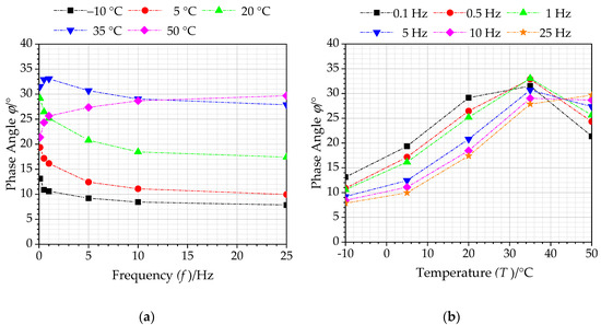 It can be observed from Figure 7b that phase angle varies with test temperature for different loading frequencies, but phase angle at each loading frequency would increase first and then decrease as the test temperature increases. For different loading frequencies, the corresponding temperatures at which the phase angle appears peak are different. This is because the bonding properties of asphalt bind is significantly affected by temperature, and the viscoelastic properties of asphalt mixtures are constantly changing with test temperature. At lower temperatures, the mechanical performances of asphalt materials are mainly determined by asphalt binder, while the impact of aggregate is relatively small. At this state, asphalt mixture is regarded as an elastic material and its phase angle is small. As the test temperature increases, asphalt mixture gradually tends to be viscous, and its phase angle increases accordingly. However, asphalt binder in asphalt mixture would soften as the test temperature continues to increase. Dynamic modulus mainly depends on aggregates inside asphalt mixture. Therefore, the phase angle will show a decreasing trend at higher temperature.