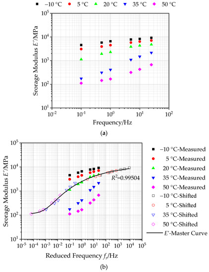Storage modulus of asphalt mixtures with basalt fiber: (a) calculated storage modulus, (b) master curves of storage modulus (reference temperature = 20 °C).