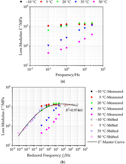 Loss modulus of asphalt mixtures with basalt fiber: (a) calculated loss modulus, (b) master curves of loss modulus (reference temperature = 20 °C).