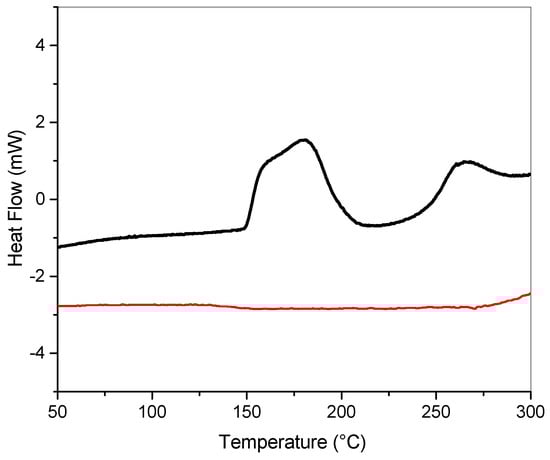 The uncured cream resin was tested before LCD printing by a dynamic temperature scan using differential calorimetry. The result is reported in Figure 1. The graph shows the presence of an exothermic peak centered at 180 C starting at 150 C (black curve). The total exothermic heat released was equal to 168.35 J/g. The exothermic peak reveals the presence of some thermally reactive groups in the daylight formulation. The cream resin is a (meth)acrylate-based resin that can be cured by photopolymerization and by heat []. The cream resin was analyzed back after the first scan and no exothermic peak was observed (Figure 1, red curve). This finding confirms that all reactive moieties were reacted in the first scan. The thermogram clearly shows a glass transition temperature at 135.6 C in the second scan (red curve) that is higher than the reported for the cream resin after LCD curing only (i.e., ≈60 C). Such an improvement can be explained as the result of the increased crosslink density caused by the thermal curing occurring in the first scan.