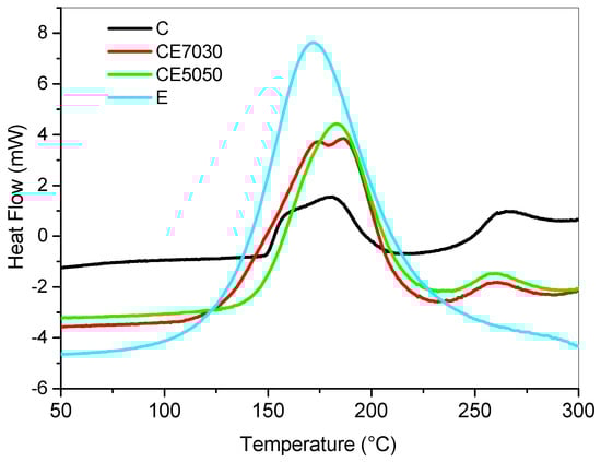 The unreacted epoxy-based blends were also characterized in their uncured state by DSC. The results are summarized in Figure 2. The addition of the thermally curable resin resulted in the increase of the released heat during the heating ramp (Table 3) as it can be expected because of the presence of a higher content of thermally curable monomers.